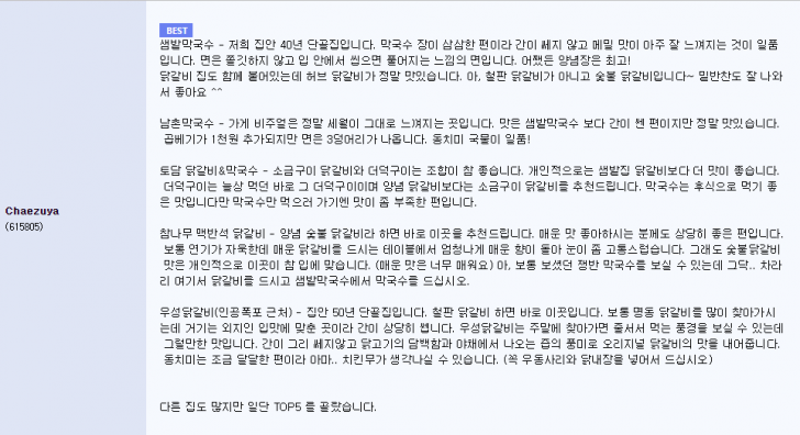 참나무 맥반석 닭갈비 - 양념 숯불 닭갈비라 하면 바로 이곳을 추천드립니다. 매운 맛 좋아하시는 분께도 상당히 좋은 편입니다. 보통 연기가 자욱한데 매운 닭갈비를 드시는 테이블에서 엄청나게 매운 향이 돌아 눈이 좀 고통스럽습니다. 그래도 숯불닭갈비 맛은 개인적으로 이곳이 참 입에 맞습니다. (매운 맛은 너무 매워요) 아, 보통 보셨던 쟁반 막국수를 보실 수 있는데 그닥.. 차라리 여기서 닭갈비를 드시고 샘밭막국수에서 막국수를 드십시오.