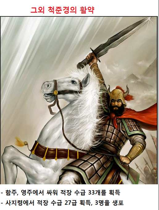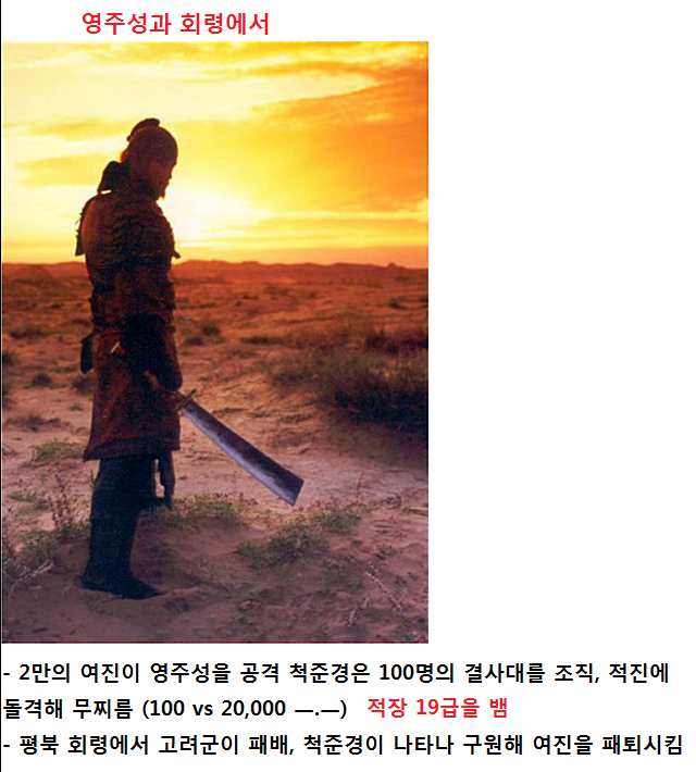 척준경은 단숨에 여진족 부관 10여명을 참살하고 적장을 활로 쏘아 거꾸러 뜨렸다.