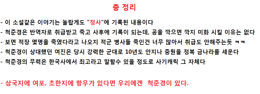 의리가 있고 충의가 있었으나 너무나 인간적인 장수. 척준경의 파란만장한 역사는 후세에도 길이 남아야 할것이다.