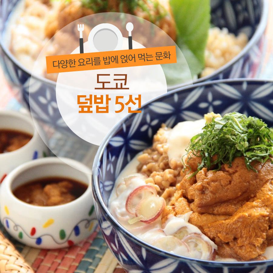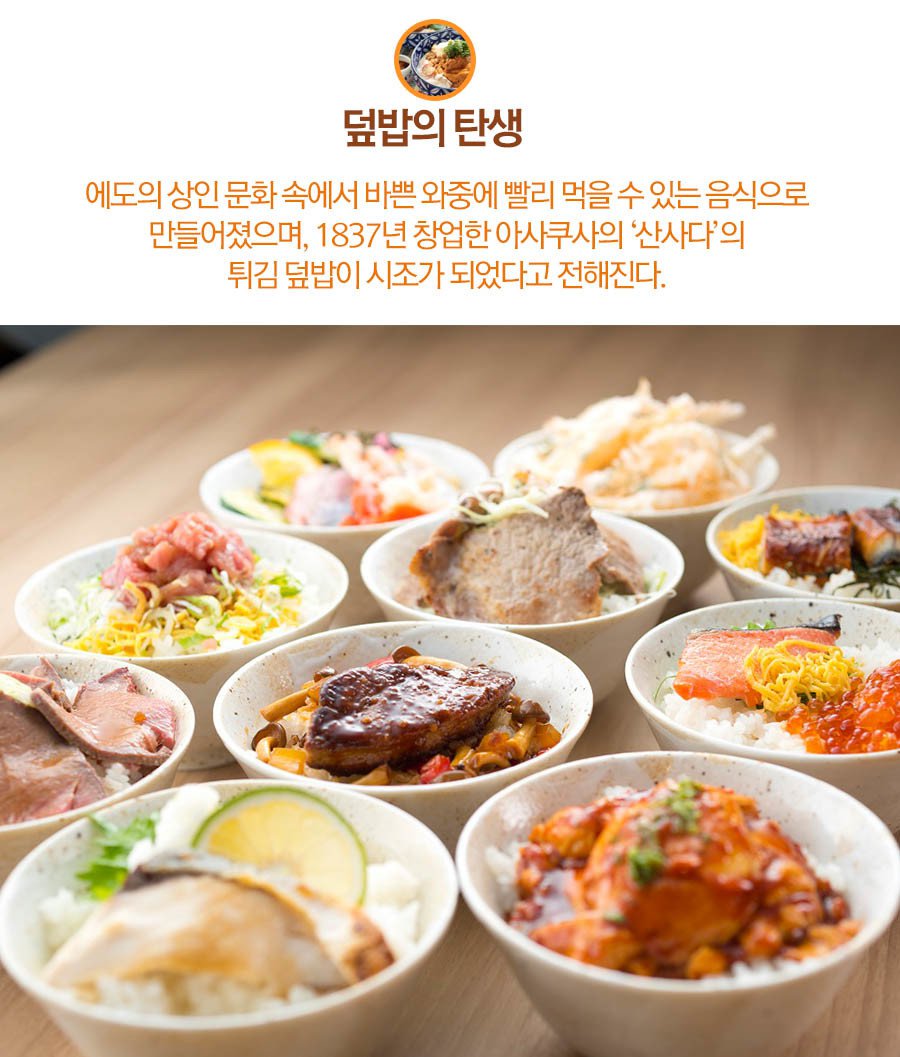 언제든지 인기있는 “장어 덮밥”은 19세기 초에 등장했고, 에도의 번화가의 인기있는 음식으로 바지락, 대합, 개랑조개와 파등의 야채를 삶아 된장국을 부어 만든 “후카가와 덮밥”은 에도시대 말기에 만들어졌다. 문명 개화기에 일본에 들어온 양파와 소고기를 달걀에 풀어 만든 “카이카 덮밥”은 메이지 초기에 전해졌으며 일본의 수험생이라면 한 번쯤 먹었을 “가츠 덮밥”은 다이쇼 시대의 초기에 등장했다. 지금까지의 백미와 반찬을 따로 먹던 상식을 엎고, 덮밥 양식은 사람들에게 널리 사랑받고 다양한 요리를 밥에 얹어 먹는 문화로 더욱 널리 알려지게 되었다