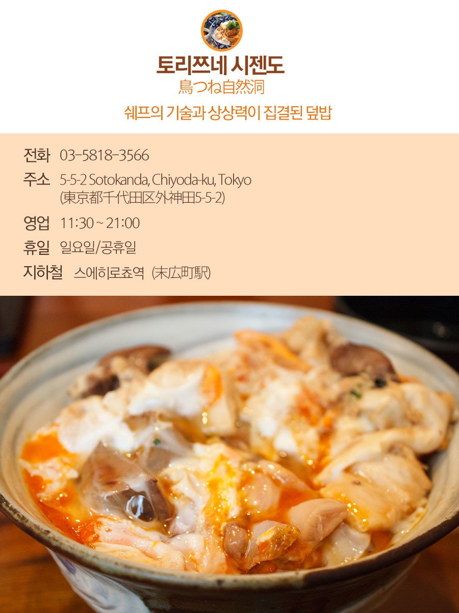 히나이 닭고기와 나고야 코칭 닭고기의 넓적 다리와 가슴살을 조합한 닭고기를 사용해 닭고기의 육질과 부드러움이 말할 필요도 없을 만큼 좋다. 쉐프의 섬세한 불조절에 의해 걸쭉해지는 달걀이 육수와 함께 어우러져 단맛을 더해주고 탄력있는 닭고기와 밥을 감싸 부드럽게 해준다.