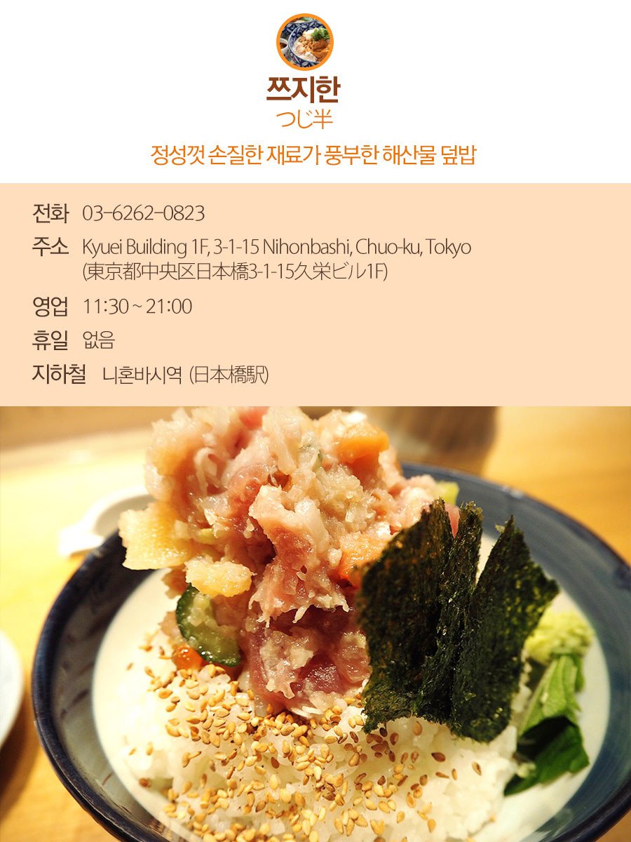 당일 들어온 재료에 따라 그 내용물이 변하는 해산물 덮밥 맛집. 각 어류와 조개가 듬뿍 담긴 모습이 압권이다. 회의 쫄깃한 식감과 조개류의 오독오독 씹히는 식감이 대조를 이루어 입이 즐겁다. 다 먹은 후에는 도미 국을 맛 볼수도 있다.