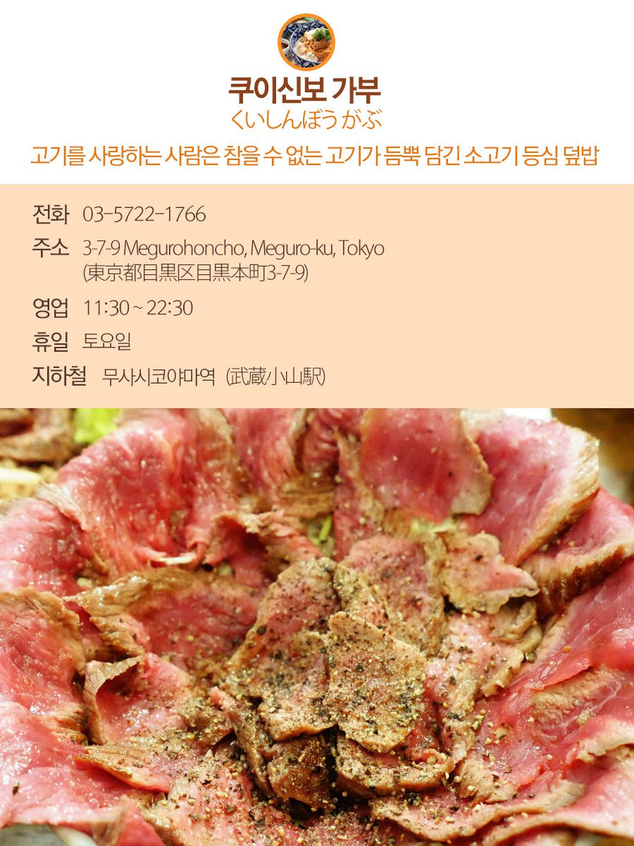 호화스러우면서 섬세한 맛의 소고기 덮밥. 부드러운 소고기 넓적다리 고기를 그대로 튀기듯 구워 여분의 불에 익혀 얇게 잘라낸다. 외국은 두툼하게 씹히는 맛이 있으며, 안은 육즙이 흐르는 레어 상태이다. 버터 향이 은은한 풍미와 빻은 후추가 식욕을 촉진시킨다.