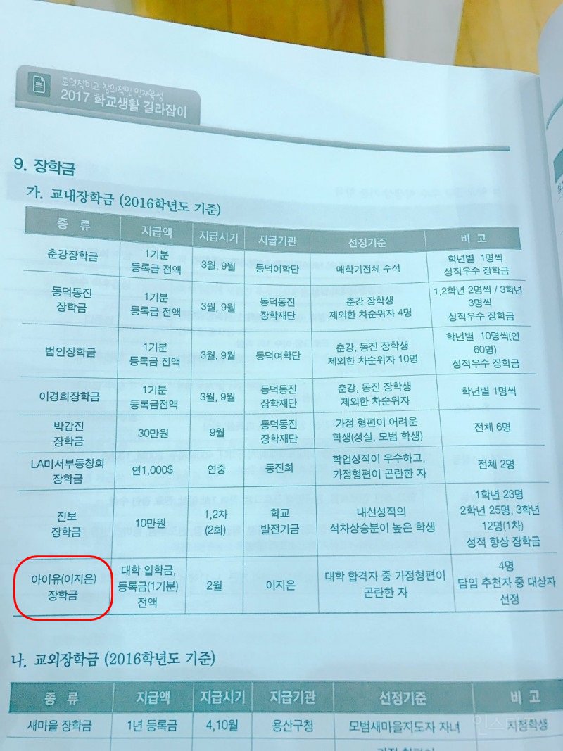 아이유 모교에는 대학에 가고 싶지만 형편이 어려운 학생들에게 매년 등록금을 기부해주는 아이유 장학금이 있음