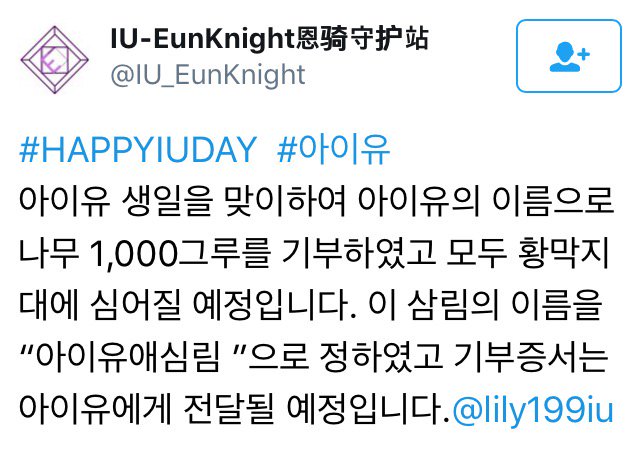 중국팬들은 아이유가 있는 한국에 미세먼지를 제거하기 위해 중국 사막에 나무 천그루를 기부함