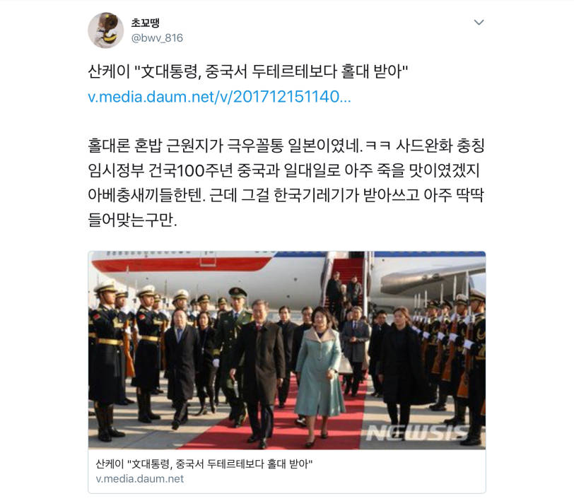 강경 우익 성향의 산케이신문은 이날 베이징(北京)발 기사에서, 문 대통령이 중국에서 푸대접을 받고 있다고 전했다.