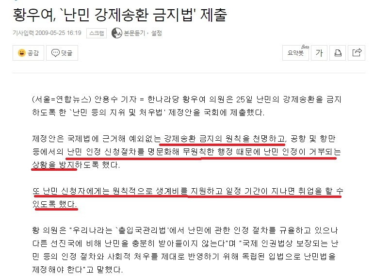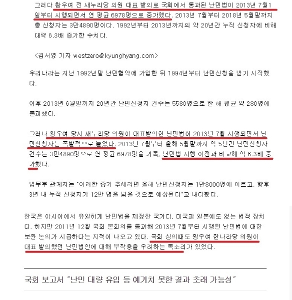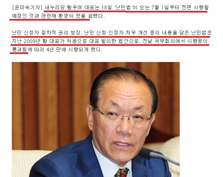 새누리 황우여가 대표 발의한 난민법 시행이 결정적~