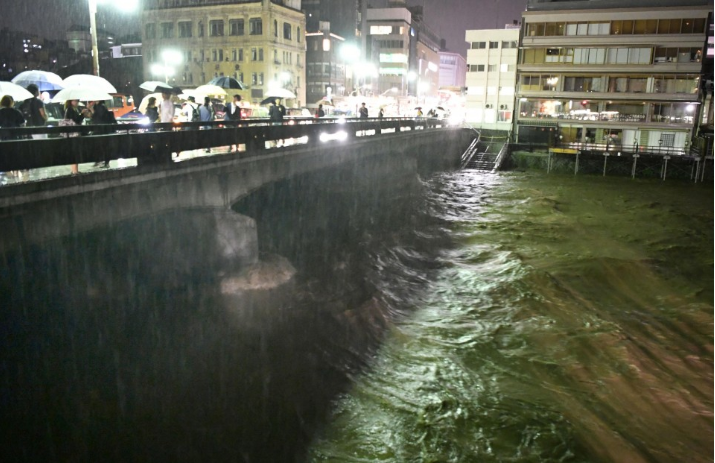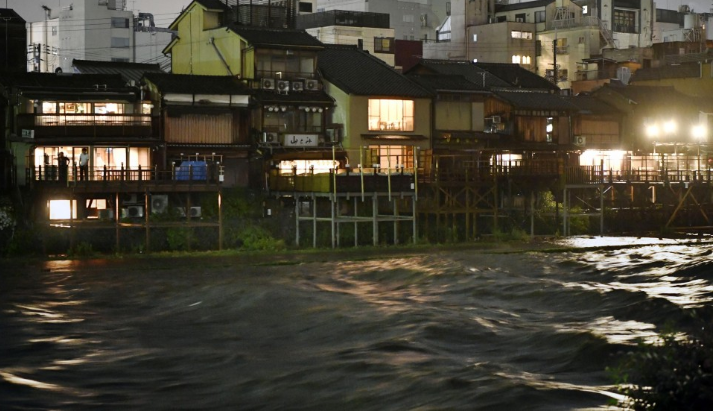 교토의 저 공터 넓던 (실)개천이 범람위기. 전철 사람몰려...