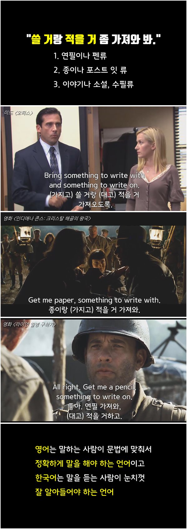 제가 처음 영어 공부할 때 I have no house to live. (나는 살 집이 없다.)가 왜 문법적으로 틀린 문장인지 이해하는 걸 굉장히 힘들어 했던 기억이 있습니다. 반드시 I have no house to live in.이라고 하지 않아도 의미가 통하는데 왜 영어 사용자들은 꼭 저렇게 전치사 in을 붙여서 말하는지 이해가 잘 되지 않았습니다. 그런데 시간이 지나고 영어라는 언어를 좀 이해하게 되니 영어 사용자들이 저런 문법 규칙을 가지는 것은 다 그만한 이유가 있더군요. 그리고 한국어처럼 정확한 문법 규칙이 없는 언어가 오히려 의사소통에 방해가 될 수도 있다는 사실을 깨닫게 되었습니다. 이 동영상은 I have no house to live.가 왜 문법적으로 틀린 문장인지 설명함으로써 영어는 말하는 사람이 문법에 맞춰서 정확히 말해야 하는 언어이고 한국어는 말을 듣는 사람이 눈치껏 잘 알아들어야 하는 언어라는 점을 밝히고자 합니다. 그리고 이러한 이유 때문에 한국어가 권위주의적 특성을 가지게 된다는 점을 설명합니다. 23분 남짓으로 다소 길지만 지금 영어를 공부하고 계시거나 예전에 영어 공부할 때 저처럼 I have no house to live.가 왜 문법적으로 틀린 문장인지 이해가 안되서 힘들어 하셨던 분이라면 재미있게 시청하실 수 있는 동영상입니다. 광고는 없습니다. 재미있게 시청해 주세요.