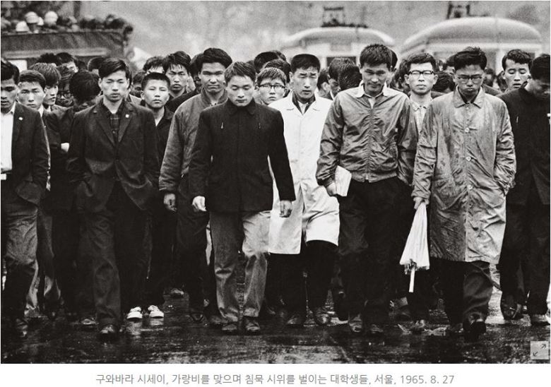한일국교정상화에 반대하여 빗속에서 침묵 시위를 하고 있는 대학생들.