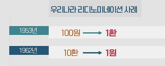- 화폐개혁(단위변경). 통화의 액면을 동일한 비율의 낮은 숫자로 바꾸는 걸 뜻함