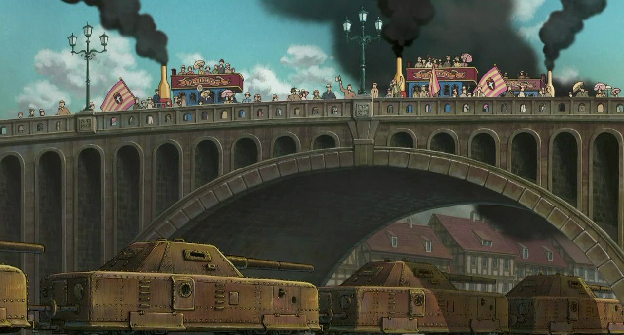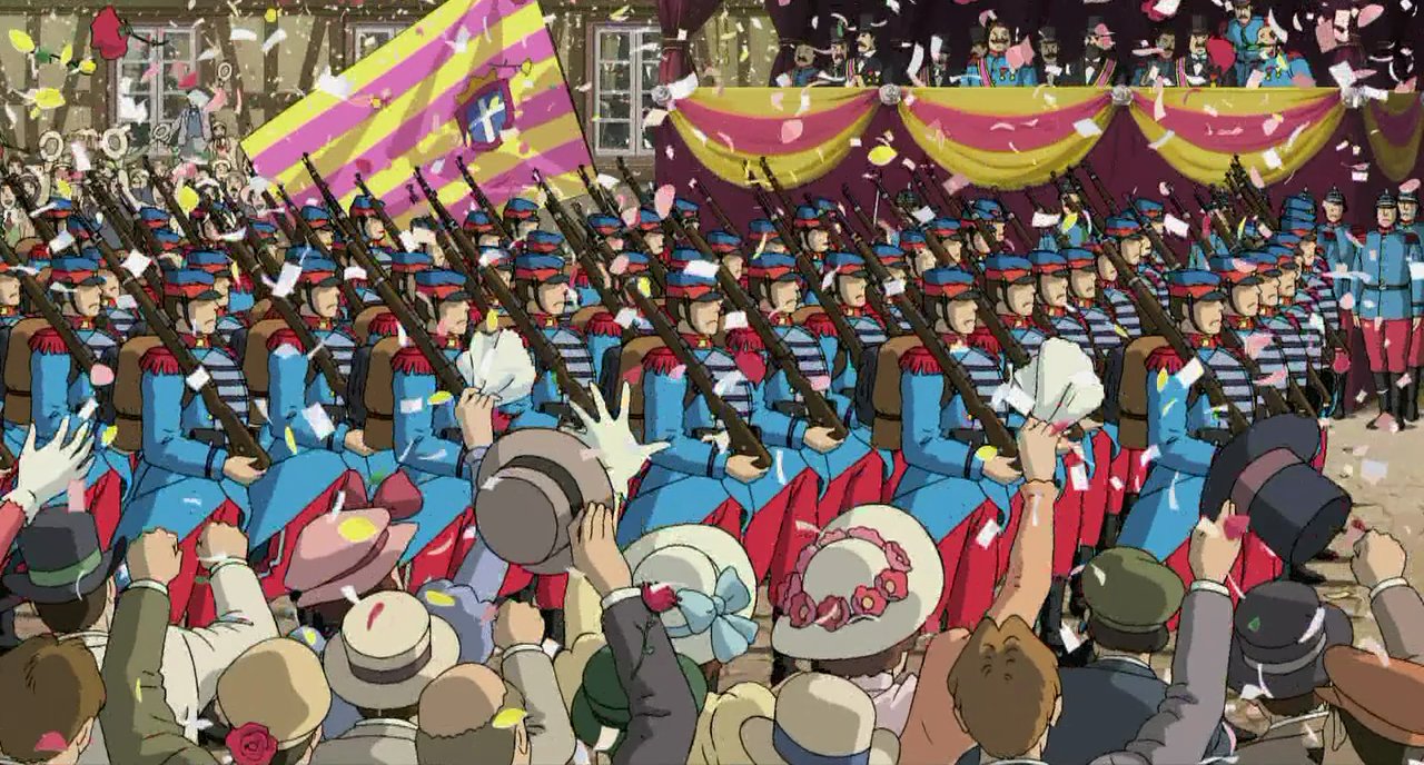 하울의 움직이는 성 역시 하야오의 반전주의, 반제국주의를 엿볼 수 있다. 마을 한가운데를 행진하는 군인들과 그 모습을 보며 국기를 흔들며 환호하는 대중들의 모습은 2차 세계대전 시절의 일본 제국을 그대로 가져다 놓은 것 같다. 그러나 하야오는 새까만 매연으로 이 장면들을 덧칠한다. 도시를 물들이는 검은 매연과 온 세상을 불바다로 만든다는 전쟁터의 검은 하늘을 연결시키는 것은 어렵지 않다.