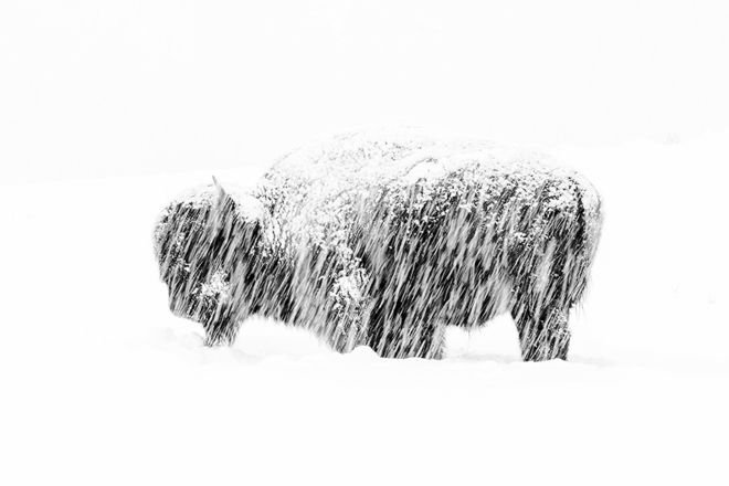 들소 한마리가 눈을 맞고 있는 모습을 순간 포착