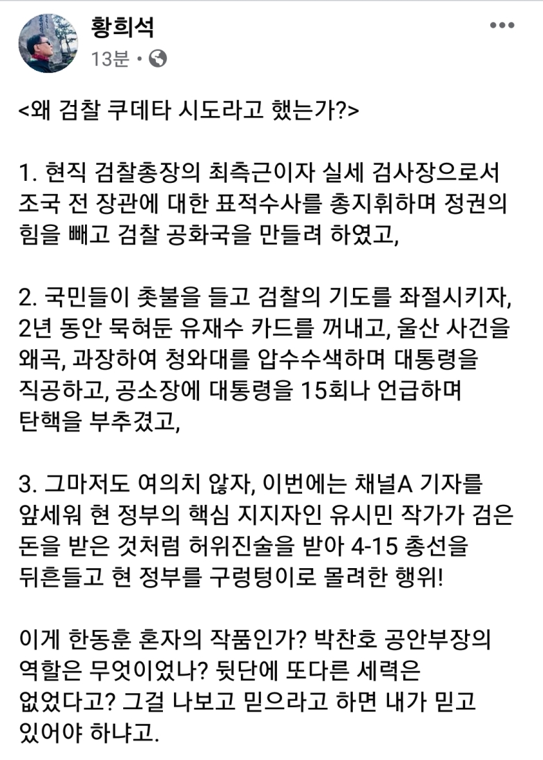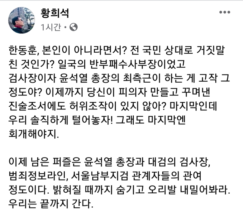 - 황희석 페북 - 한동훈 고작 그정도야?