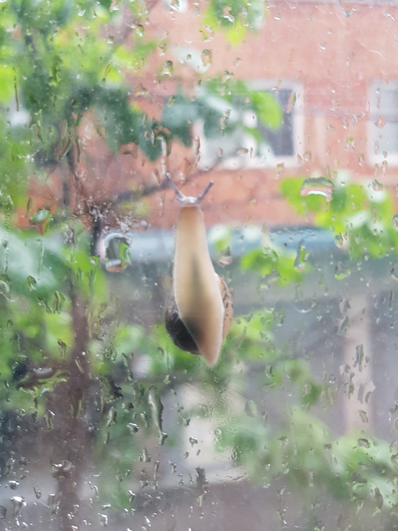 창문에 나뭇잎이 붙어 있는줄 알았는데, 달팽이예요.