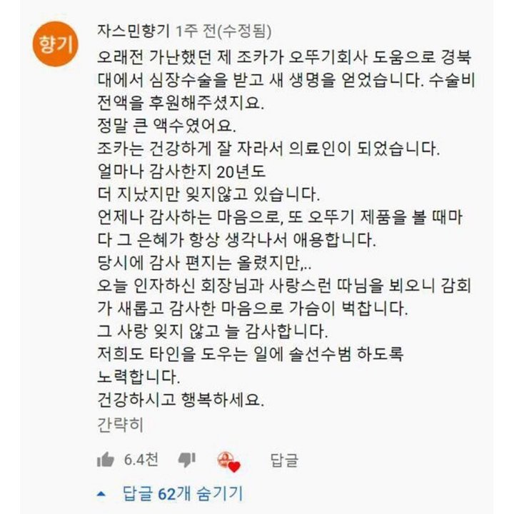 - 오뚜기 회장님의 딸 유튜브채널에 올라온 댓글