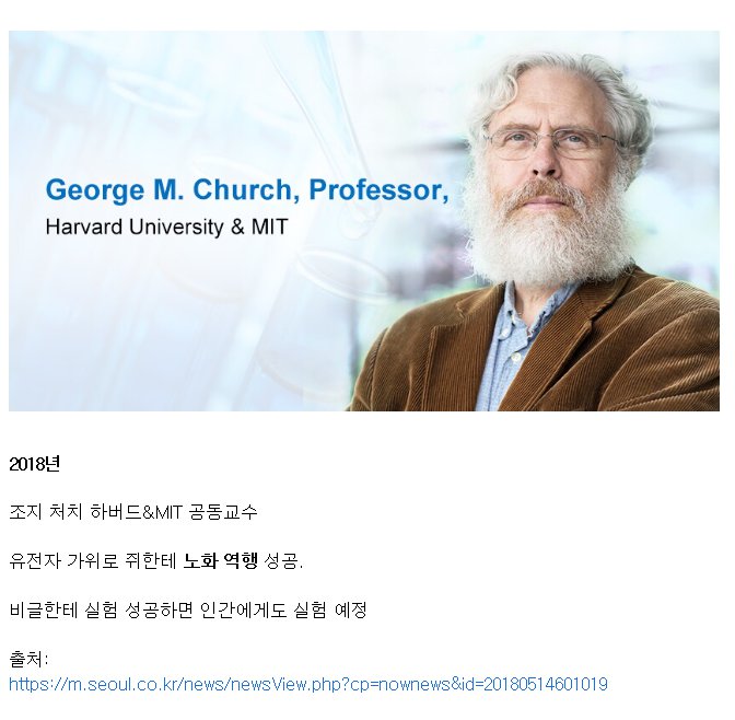 잘 되면 노화를 멈추는 것 뿐만 아니라 역행도 할 수 있고 유전자 가위 기술은 이미 굉장히 크게 진전된 상태.