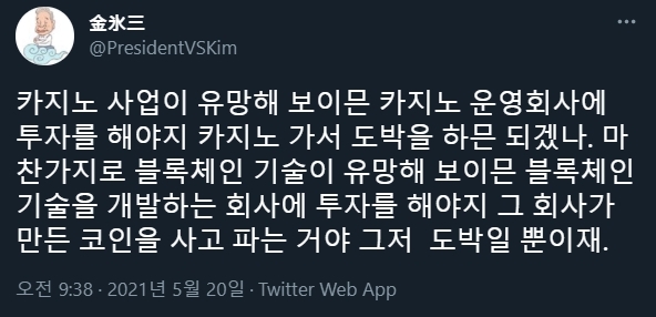 - 김빙삼 : 코인을 사고 파는 거야 그저 도박일 뿐이재.