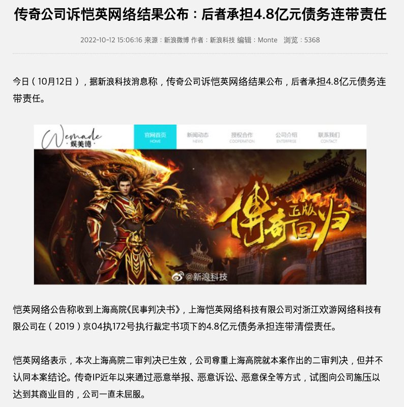 중국의 절강환유라는 개발사 그리고 킹넷이라는 중국의 퍼블리셔가 한국 위메이드의 대표 IP인 에 대한 사용계약을 맺었는데 돈을 잘 벌기 시작하자 늘 그렇듯이 중국애들 특유에 배째라 전술이 등장했다.
