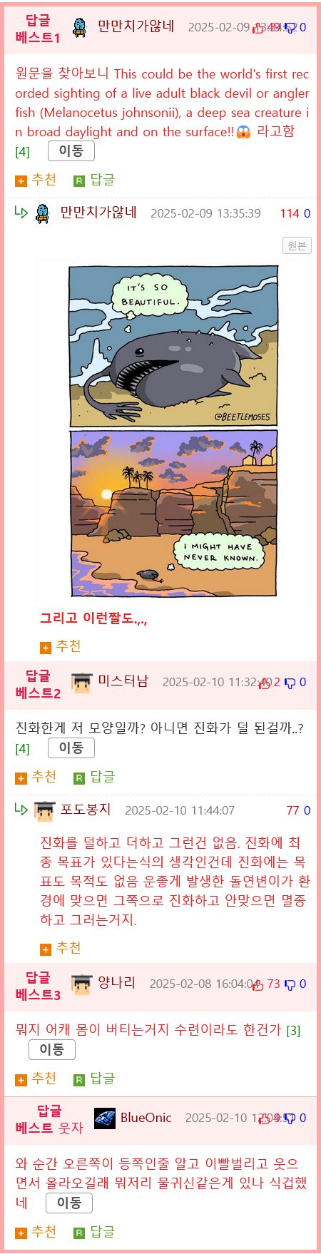 보통 심해 잠수함 영상 이외에 표면에서는 죽은 것만관측됨