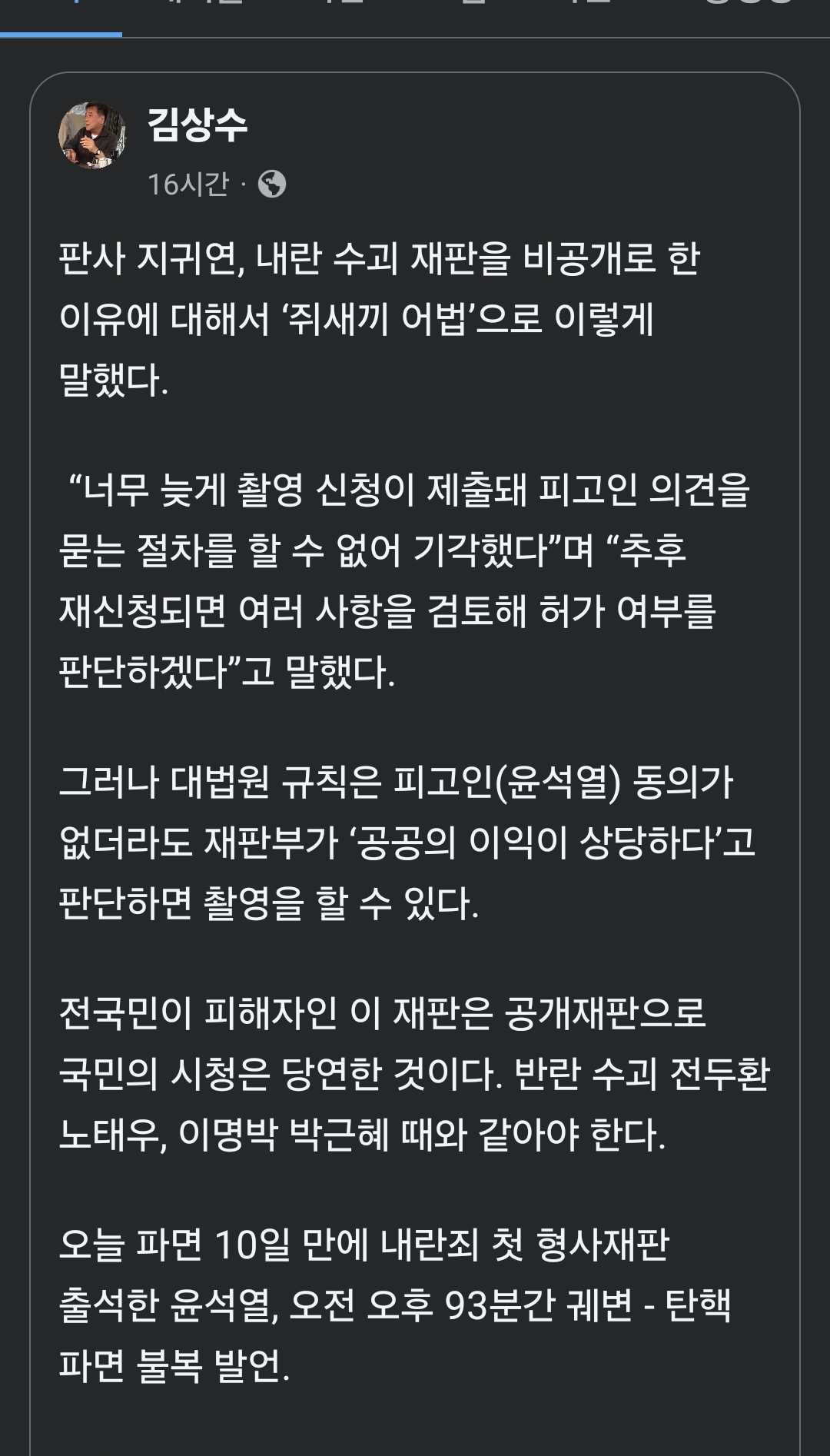 - 속보)굥재판 언론 비공개 이유가 법정 촬영 신청 늦어 불허..“