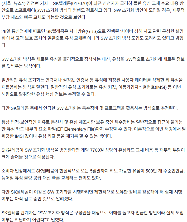 - 유심 소프트웨어 초기화 검토하는 SKT…이유는