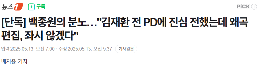 - [단독] 백종원의 분노…김재환 전 PD에 진심 전했는데 왜곡 편집, 좌시 않겠다