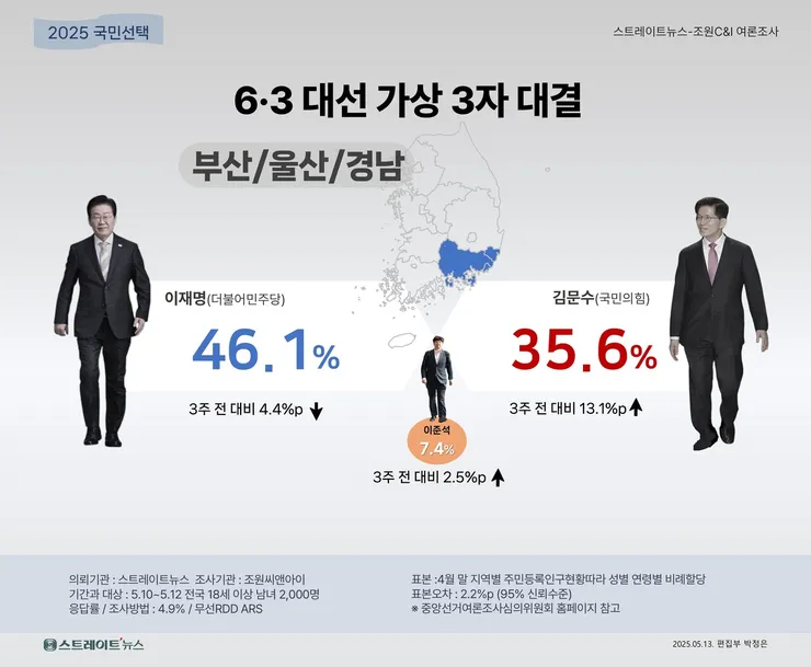 가 조원씨앤아이에 의뢰해 지난 10~12일 실시한 여론조사 결과 부산·울산·경남 지역에서 더불어민주당 이재명 후보 46.1%, 국민의힘 김문수 후보 35.6%로 이 후보가 김 후보보다 10.5%포인트 앞선 것으로 나타났다. [스트레이트뉴스]