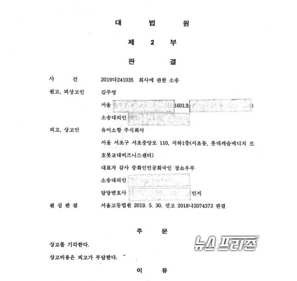 결국 한국 기업 유미소향의 대표는 소송을 걸어 2019년 5월 대표이사직 해임사실 무효 판결을 얻어냈다.