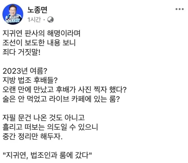 - 노종면 의원 - 지귀연 판사의 해명이라며 조선이 보도한 내용 보니 죄다 거짓말!