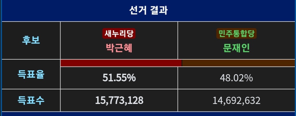 또한 문재인대통령과 박근혜 표차이는 1,080,496입니다