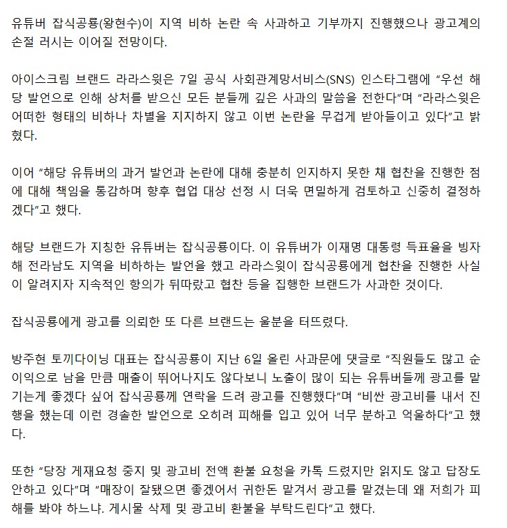 - “전라도 ○랄 났네” 잡식공룡, 사과에도 광고주 ‘손절 러시’