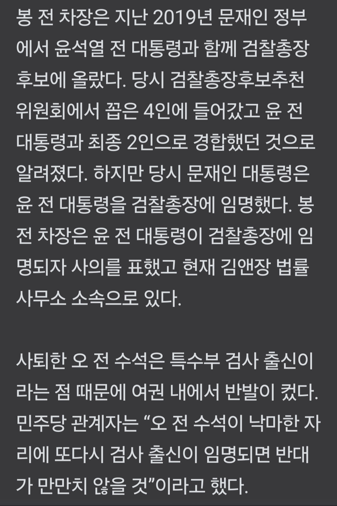 여권 관계자는 이날 “봉 전 차장을 비롯해 검찰 고위직을 지낸 인사 여럿을 대상으로 검증 작업이 진행 중”이라며 “검찰 출신 인사를 검토하는 건, 검찰을 가장 잘 아는 인사가 민정수석을 맡아야 검찰 개혁을 잘 이끌 수 있을 거라는 판단 때문”이라고 했다.