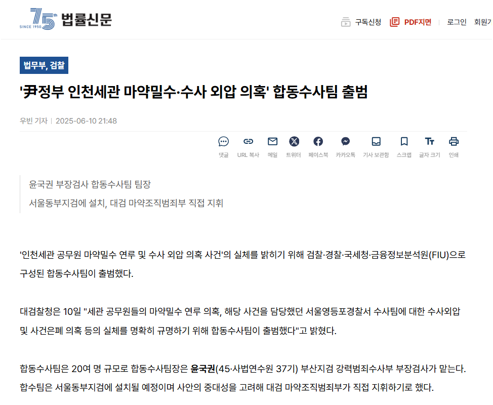 - 동부지검장 임은정 : 지난 10일 심우정, 인천세관 마약밀수 합동수사팀, 동부지검에 설치