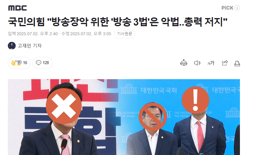 - 국짐 방송장악 위한 방송 3법은 악법‥총력 저지 --> 방송3법 검증완료