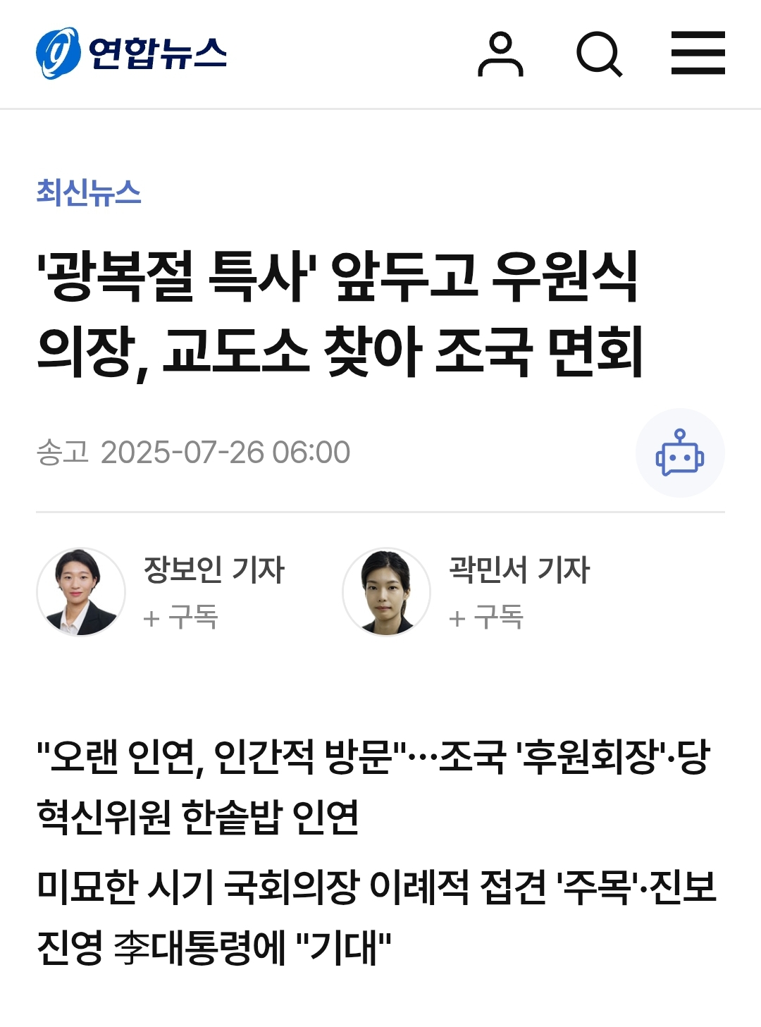 혹시라도 조국 뭍을까봐 또는 조국 잘되는게 싫어서 외면하던 민주당 의원들만 있더니, 우원식 국회의장이 공개적으로 조국 면회를 갔다니, 대인배라고 인정하지 않을 수 없다.