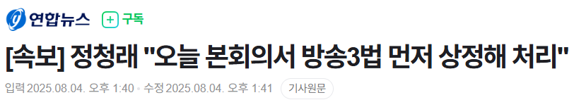 - [속보] 정청래 오늘 본회의서 방송3법 먼저 상정해 처리