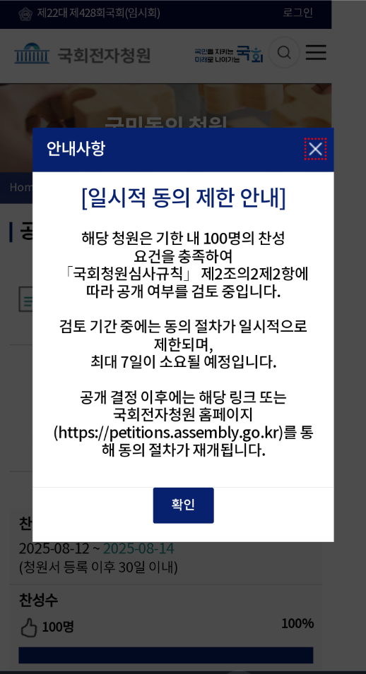 청원 링크에 들어가 보니 100명 인원이 채워져 지금은 동의가 안되네요.