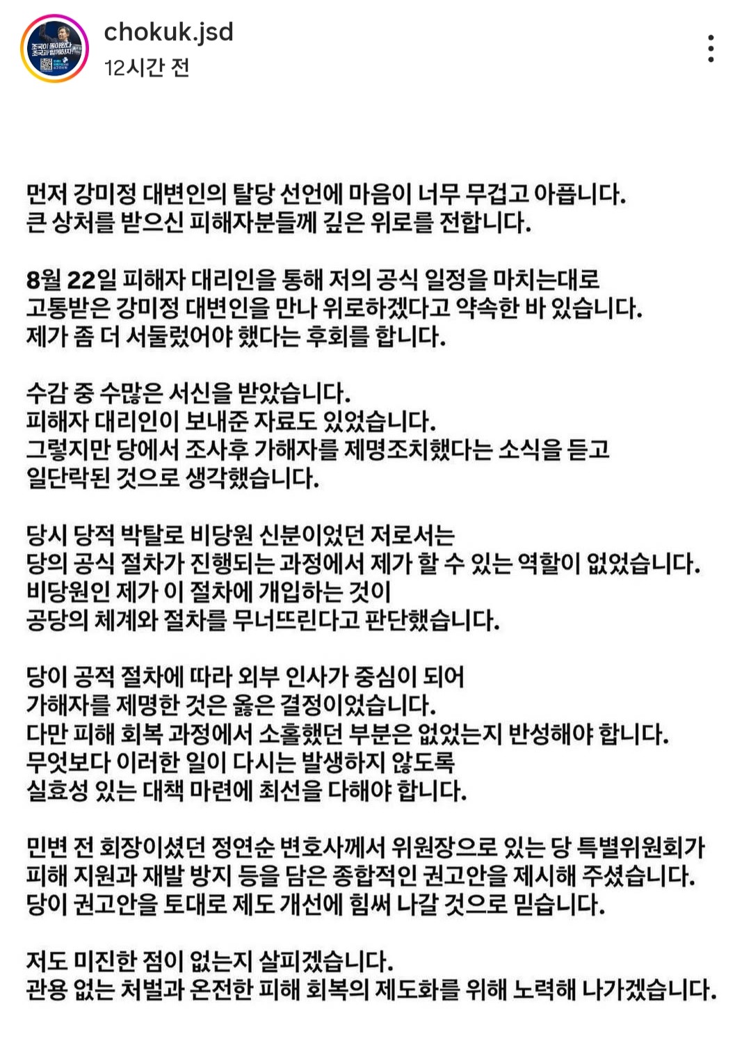 - 강미정 탈당기자회견 관련 조국 입장문
