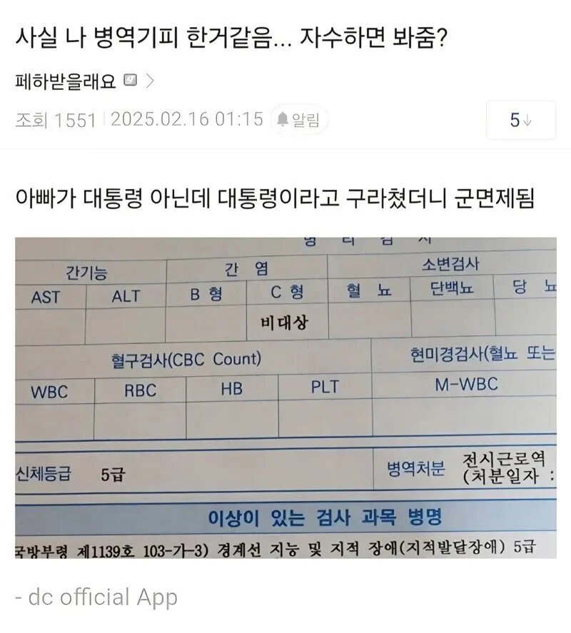 - 아부지 대통령이라서 군면제됨