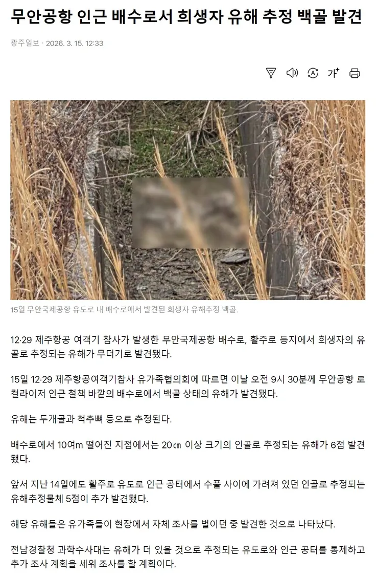 - 무안공항 인근 배수로서 희생자 유해 추정 백골 발견