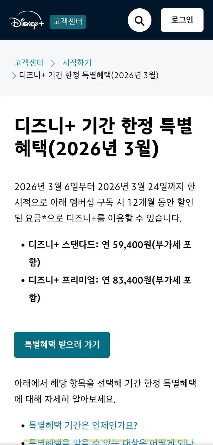 - 디즈니플러스 구독료 할인중 ~3/24