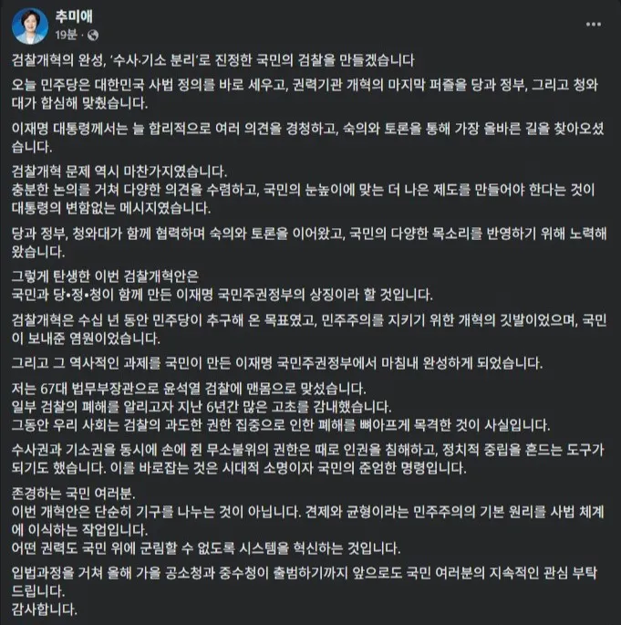 - 추미애 위원장 페북 메시지(검찰개혁 당정청 협의안 관련) | 260317 0914