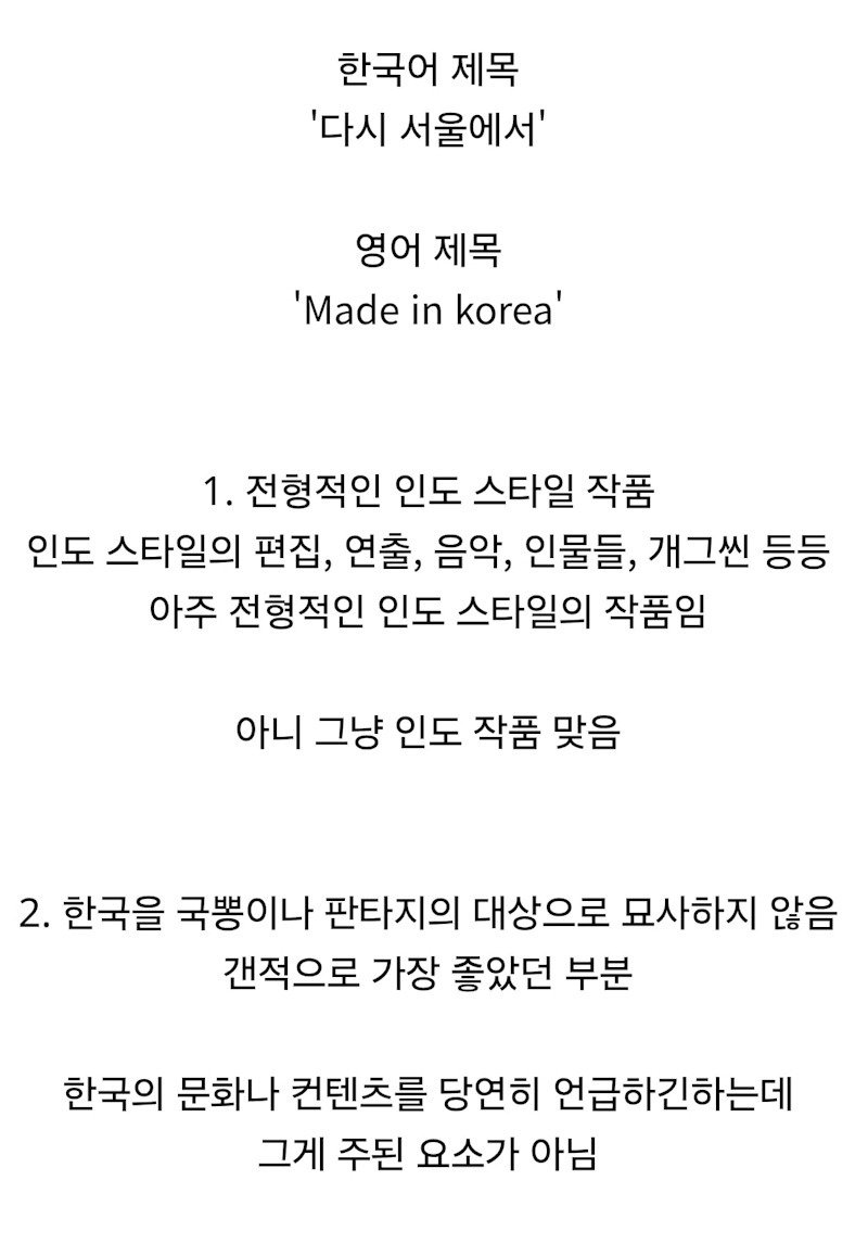 - 현재 넷플릭스 전세계 7위인 인도 영화 “다시 서울에서“