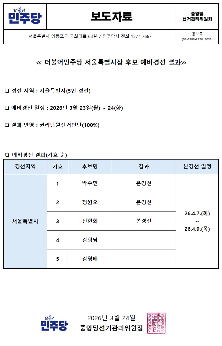 - [속보] 박주민·정원오·전현희 與 서울시장 본경선 진출