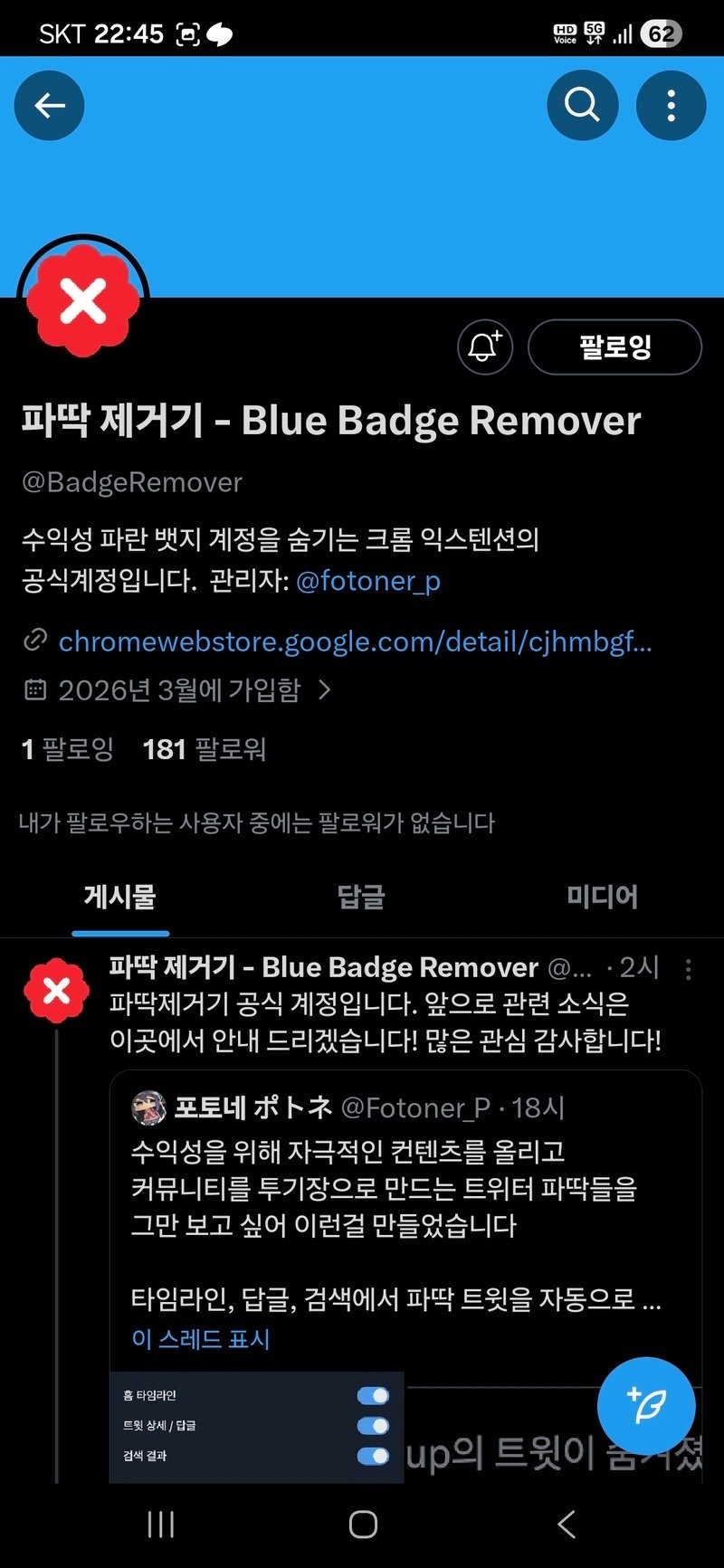 파란딱지 계정을 안 보이게하는 프로그램 만드는 사람 등장