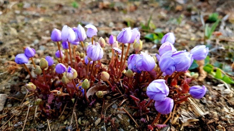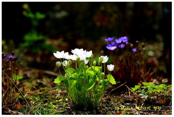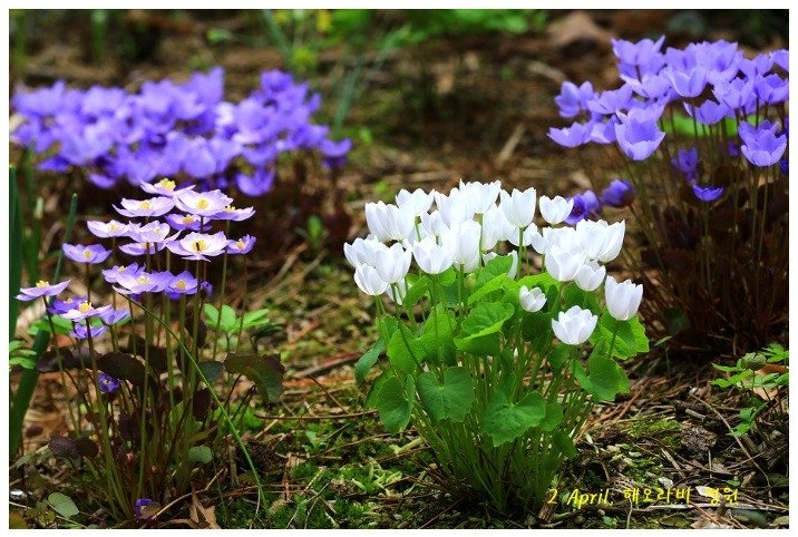 보라색과 흰색의 꽃을 피우는 깽깽이풀